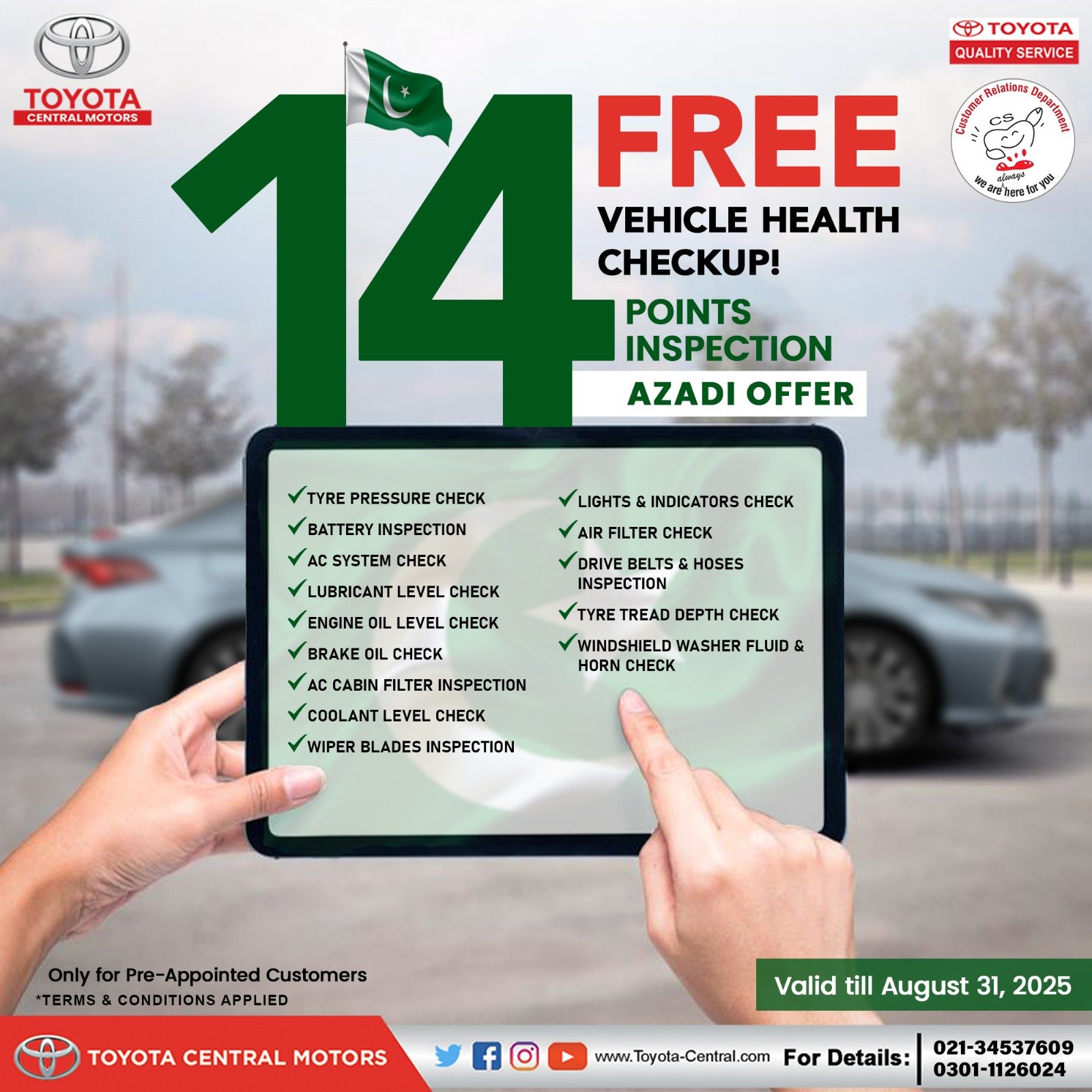 Topics #featured #free car inspection Karachi #Pakistan #Toyota 14-point check #Toyota Central Motors free inspection #Toyota maintenance offer August 2025 #Toyota Pakistan Independence Day offer #Toyota safety check Pakistan #trending pakistan